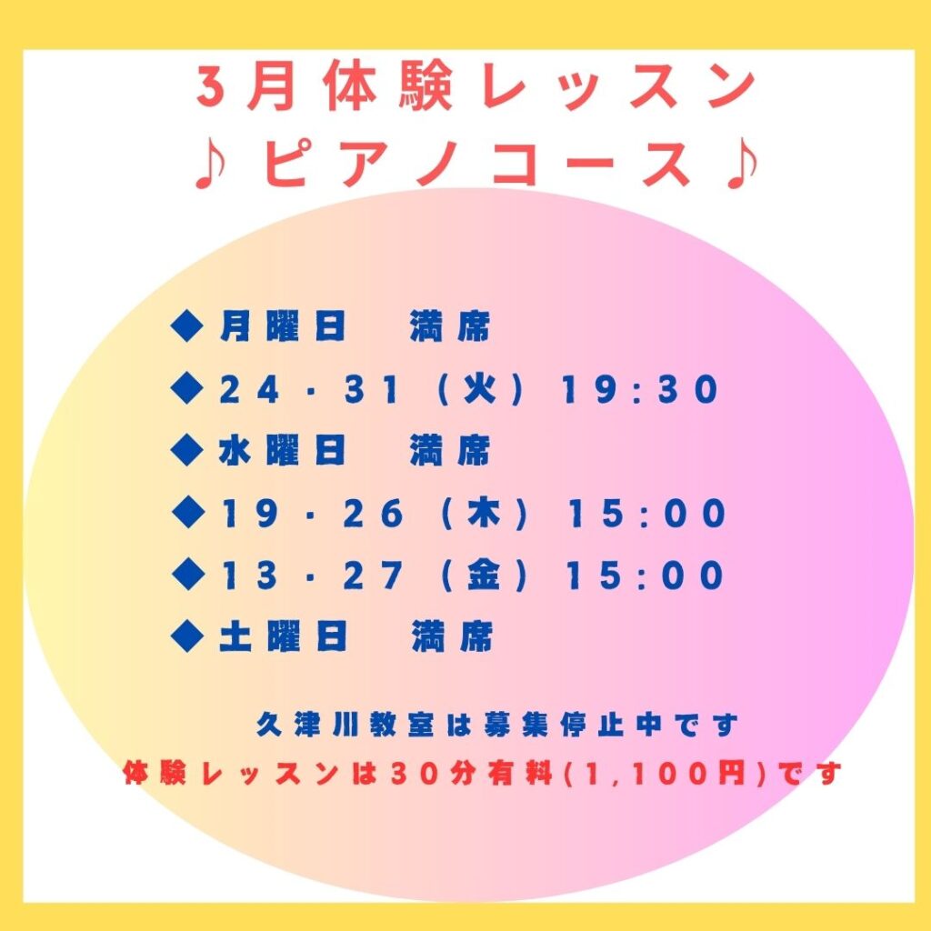 ピアノコースのみ、体験レッスンを再開します。リトミック・ピアノであそぼコースは5月より再開します。